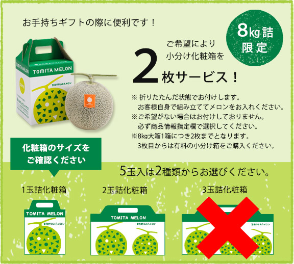 ●ご希望により、1玉詰または2玉詰用小分け箱を合わせて2枚までサービスでお付けいたします。